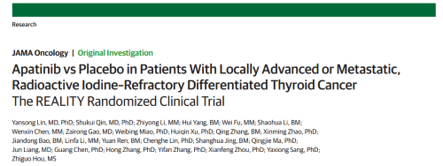 2021年12月16日,权威医学杂志《JAMA Oncology》(影响因子31.777)在线发表阿帕替尼的一项III期临床研究(REALITY)——甲磺酸阿帕替尼片治疗局部进展/转移性放射性碘难治性分化型甲状腺癌(RAIR-DTC)患者的多中心、随机、双盲、安慰剂对照临床研究。此研究由北京协和医院的林岩松教授和南京金陵医院的秦叔逵教授发起,在全国21个研究中心展开,由AG视讯医药中央医学事务部团队支持完成。